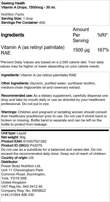 Vores Vitamin A-dråber fra Seeking Health er et vegetarisk, flydende kosttilskud, der leverer 1.500 mcg RAE A-vitamin per dråbe. Dette essentielle næringsstof er afgørende for at opretholde en sund immunfunktion, synet samt normal vækst og udvikling. Det understøtter også hudens og slimhindernes sundhed. Vores produkt er ideelt for dem, der ønsker at optimere deres indtag af A-vitamin eller har behov for et supplement, især hvis de finder det svært at sluge piller eller kapsler.