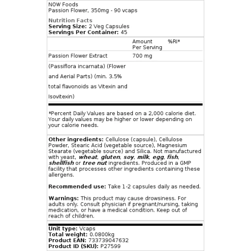 NOW Foods - Passion Flower er et kosttilskud, der indeholder 350 mg passionblomst pr. vegetabilsk kapsel. Dette produkt er designet til at være en del af din daglige rutine og tilbyder en naturlig måde at støtte dit generelle velvære på.